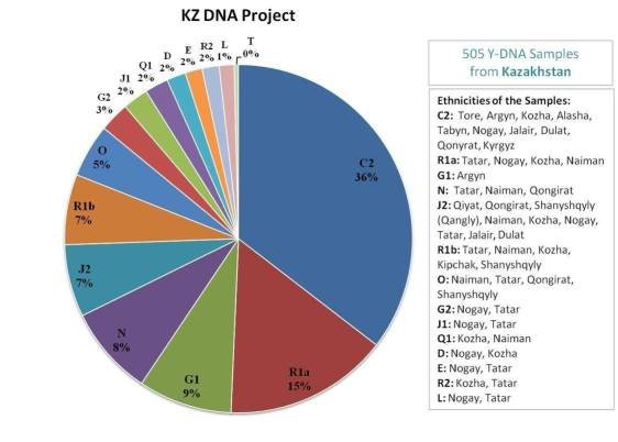 Данные Y-хромосомы Проекта Казахстанской ДНК показывают, что среди его членов-мужчин есть гаплогруппы Y-ДНК C3, C3 *, C3c, G, O3a3c, O2, Q1a3, E1b1b1, N1c1, R1a1, R1b1b1, R2, J2a1, J2a и J2. C3 (M217, P44) не только распространен среди казахов, но и часто встречается в Монголии. Члены племени кыпчак были найдены в O3a3c и R1b1b1. Члены племени аргын (= басмал, что означает «смешанное племя») имеют гаплогруппу G, которая, очевидно, пришла к ним с юго-запада. Казахи, несущие J2, вероятно, получили его от народов северной части Западной Азии, таких как персы. Кожа (Кожа, Ходжа) - это подгруппа казахов, которые происходят от арабов, и в этом проекте участники были признаны принадлежащими к гаплогруппам E1b1b1 (распространенным на Ближнем Востоке) и Q1a3. Вопрос, вероятно, пришел к казахам от их тюркоязычных предков. R1a1 (и его подтипы) очень распространен среди славян восточной Европы и кыргызов, а также встречается в других регионах, таких как Восточная Сибирь и Южная Азия.